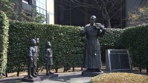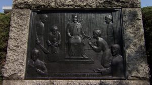 ●西洋劇発祥記念碑 1560年のクリスマス、豊後府内のキリスト教会で演じられた劇の様子で、日本人の信徒たちによる最初の西洋劇といわれています。その時の演目は「アダムの堕落と贖罪の希望」「ソロモンの裁判を願った二人の婦人」で、いずれも聴衆の感動と涙を誘い、よろこばせたといわれています。