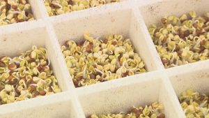ピリっとした辛味が特徴のカイワレ。大分では唯一、大分市津守にある植木農園で栽培されています。カイワレの成長は速く、種をまいて収穫・出荷するまでにかかる日数はたったの4日間!2時間ごとに成長度合いを確かめながら水やりや日光の調整など…目が離せないそうです。