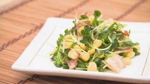 また、植木農園ではハウスの暖房や、冬場の水の温度調整に温泉水を使うなど、大分ならではの栽培方法を行っています。スプラウトと呼ばれる発芽野菜の一種で、ミネラルやビタミンが豊富なカイワレを今回はサラダで頂きました。見た目にも鮮やかでカイワレのさわやかな辛味がクセになる一品です。ぜひご家庭でご賞味ください!