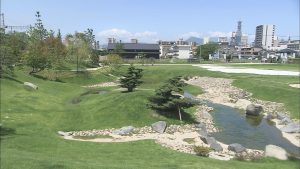 戦国時代に築かれた大名館の中でも最大級の面積を誇る大友氏館の庭園が450年以上の時を経て現代によみがえりました。庭園の一番の見どころは、左右で違う景色を楽しめる大きな池です。池の周りに配置された大きな景石は実際に発掘したものから形を取り忠実に再現したものが、また、発掘状態の良い一部の景石は当時のものがそのまま飾られています。