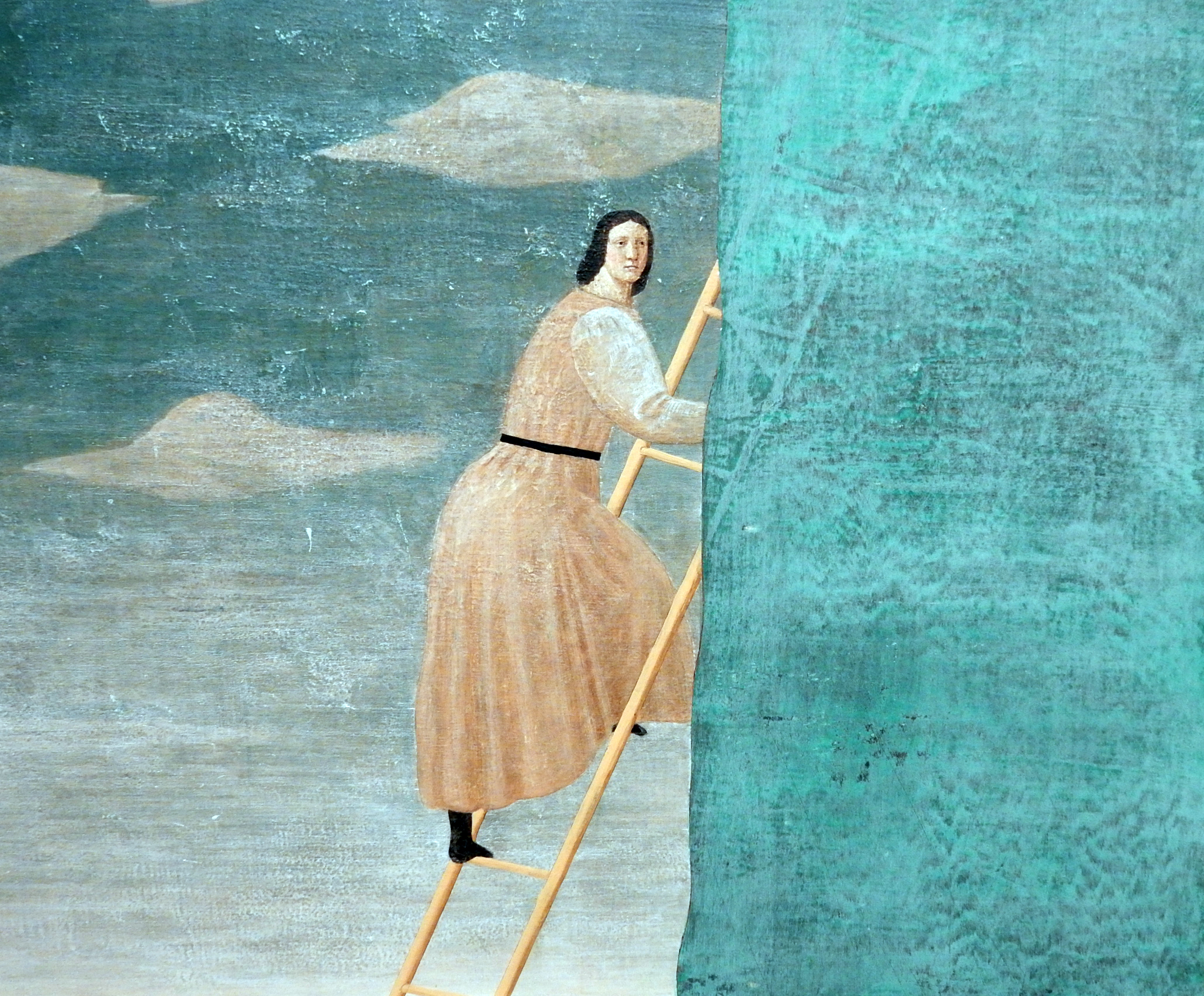 そして、日本の岩絵の具を使い、描いては削り、描いては消し、さらに塗り重ねることを繰り返すことでフレスコ画の数百年のときを経た質感を独自の方法で作り上げていきました。