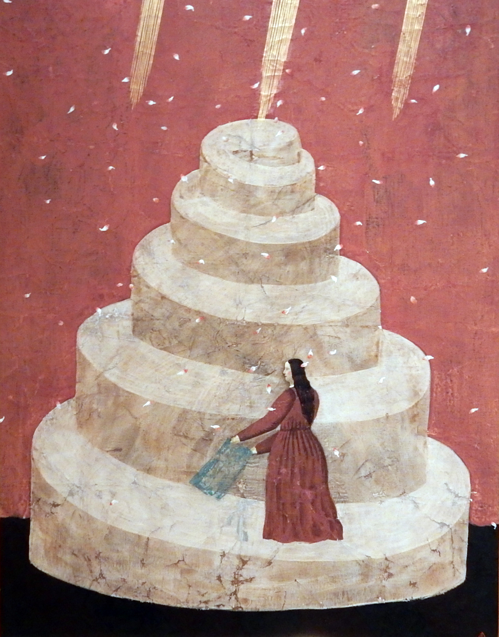 天上からは、細く強い光のシャワーが降り注いでいます。はらはらと舞う、薄紅色の花びらが印象的な絵画です。